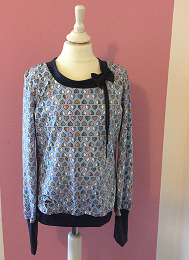 Vincenza das süße Schleifchenshirt ist ein mädchenhaftes, verspieltes Shirt aus Baumwolljersey. Es lässt sich über Hosen ebenso perfekt tragen wie über Röcken. Es ist natürlich superbequem und figurumspielend ohne aufzutragen. Die Bündchen und die Schleife sind aus farblich abgesetztem Jersey, so dass es durch und durch flexibel ist.