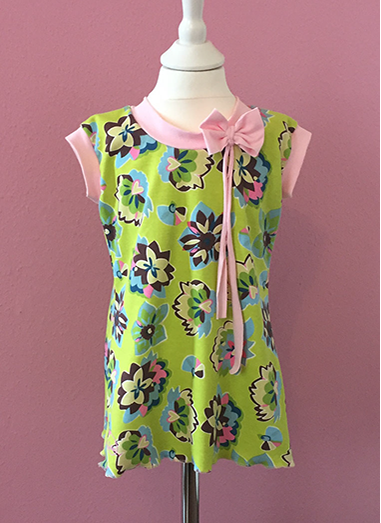 Anny ist ein mädchenhaft verspieltes Kleid mit liebevollen Details. Armabschlüsse und Taille werden durch farblich kontrastierte Schleifen in Szene gesetzt.